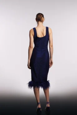 Main: 76% polyamide 21% metallised fibre 3% elastane Back: 87% polyester 13% elastane Lining: 100% polyester Trim: Feathers. Hand wash only. Length: 121cm