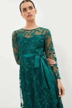 Fitted with fluttering cape-like sleeves, this gauzy midi dress lends quiet glamour to summer weddings. A luxe lace bodice offsets swishy pleats that drape to a demure below-knee length ? add metallic heels for a modern finish.