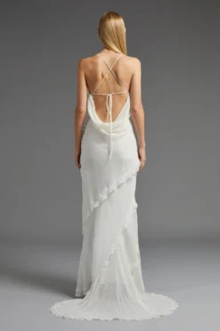 Nodding to the ‘90s with its fluid, slip silhouette and whimsical ruffles, this draped maxi dress makes a captivating choice for special get-togethers. The slender straps cross over elegantly at the back, highlighting polished shoulders and a daringly draped back detail. It pools graciously at the feet, framing embellished sandals to polished perfection.